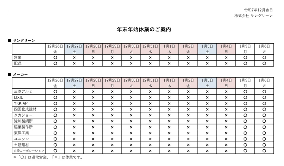 併せてメーカー様の冬期休業につきましてもご案内させていただきますので、よろしくお願いいたします。